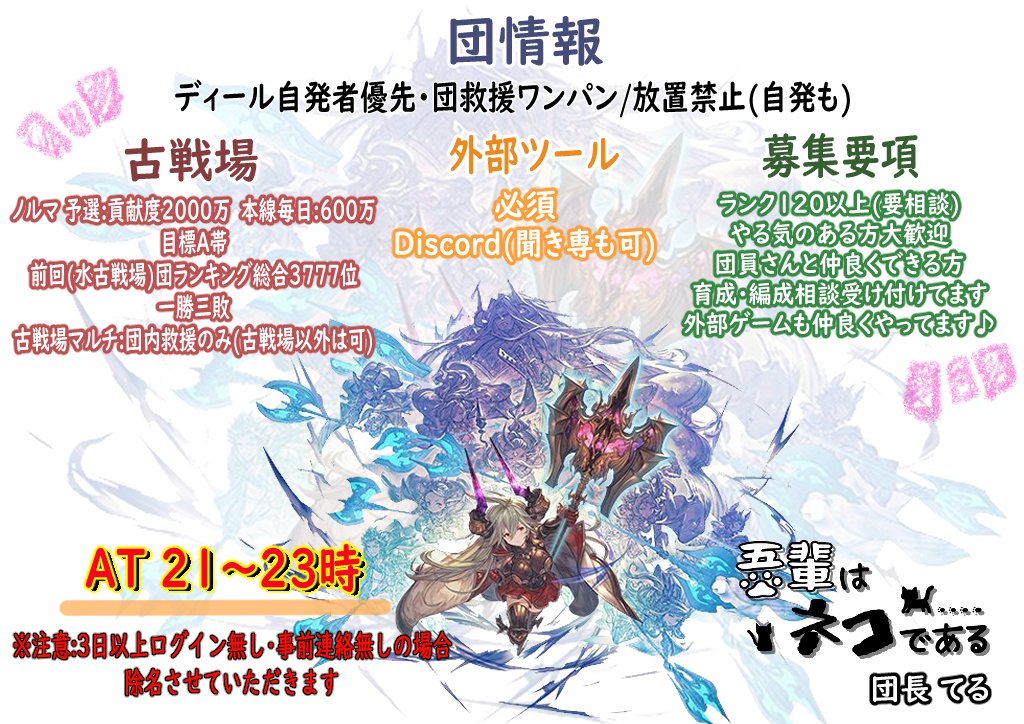 照 吾輩はネコである は 定住予定の団員さん1名を募集中です みんなでゆる くグラブルしたり スプラやスマブラなどのゲームをしていたりする楽しい団です 下記に記載の画像を見て入団希望や不明点などございましたら お気軽にdmでお聞きください